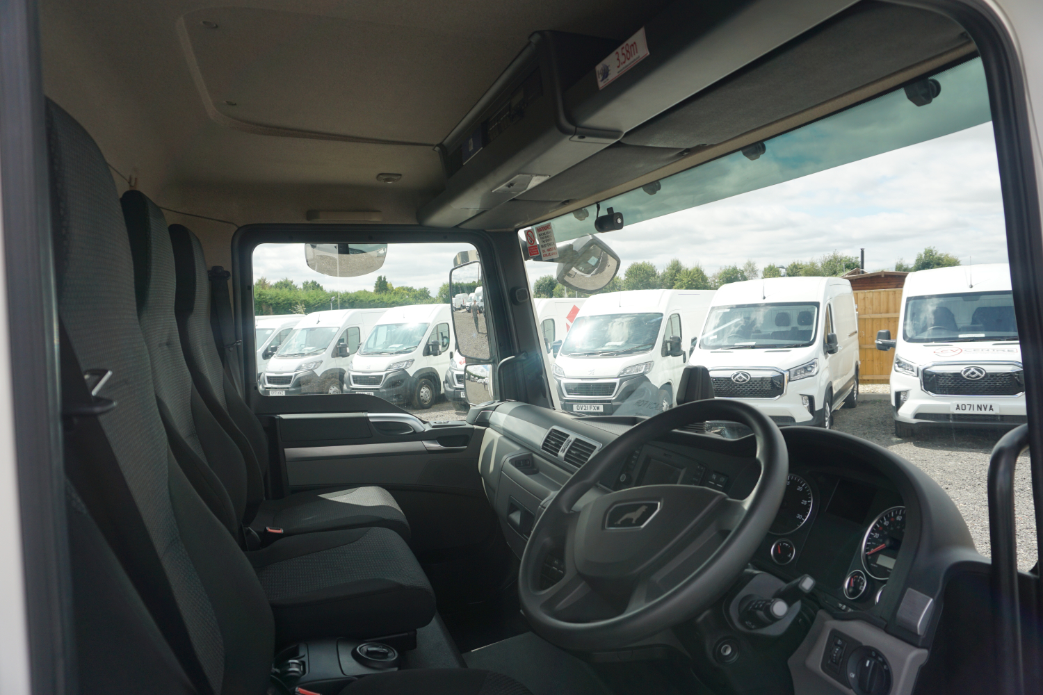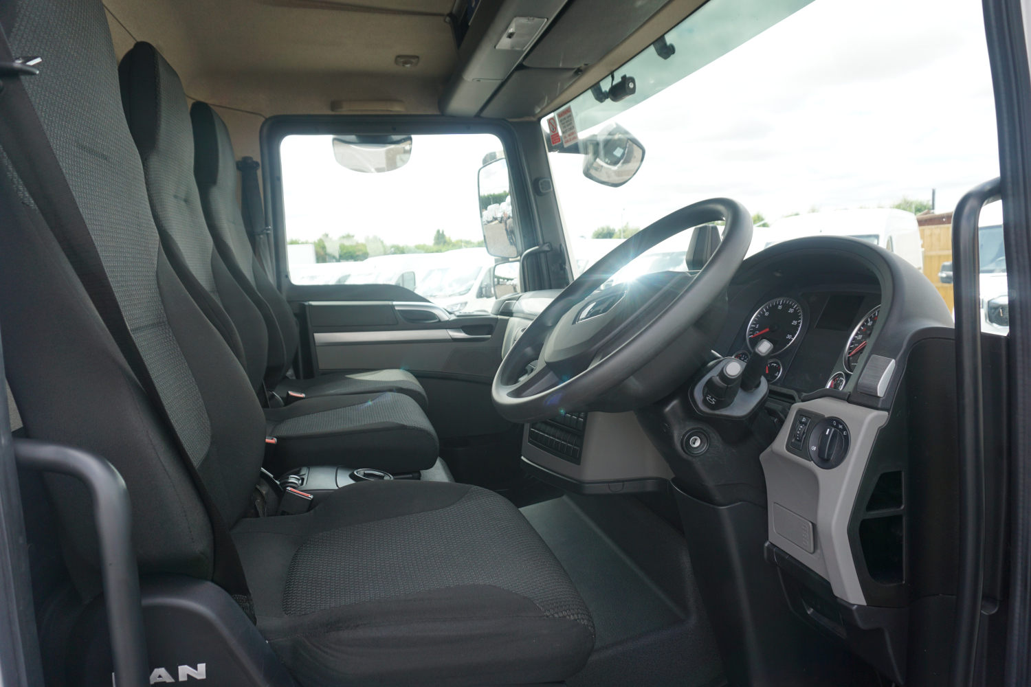 Three-seat cab with a wide dual-passenger bench.